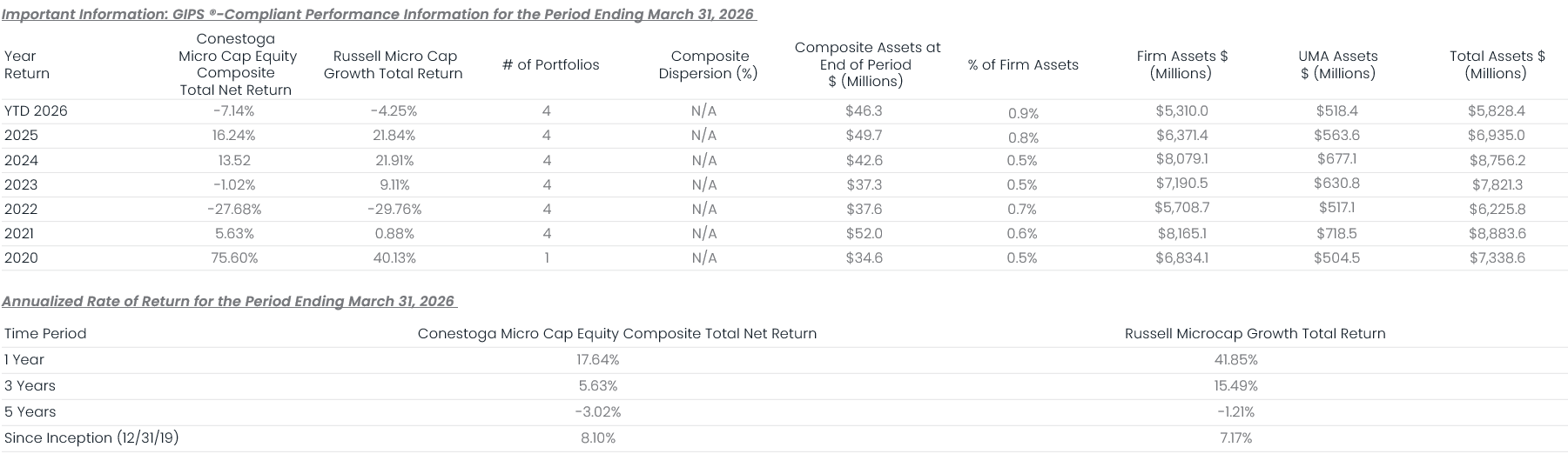 UMA assets presented are not part of Conestoga’s GIPS-defined firm assets as Conestoga has no trading authority over these assets and serves in an advisory-only capacity. UMA assets under management are received on a preliminary quarterly basis, which are subject to change by the plan sponsor after a complete reconciliation of the underlying accounts. The “Total Assets” include UMA assets and are not part of the GIPS firm assets. UMA and Total Assets are shown as supplemental information.