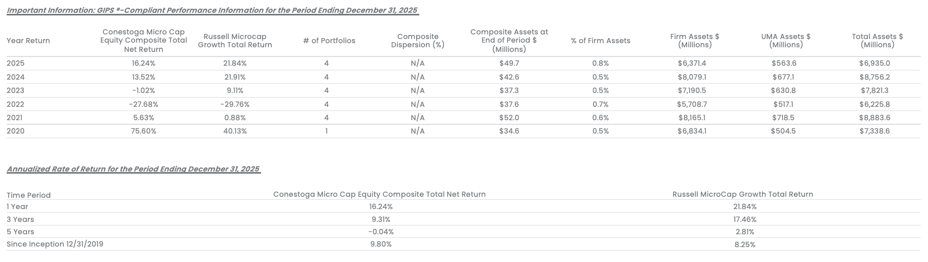 | Conestoga Micro Cap Composite (Net) | -1.91% | 16.24% | 16.24% | 9.31% | -0.04% | 9.80% |