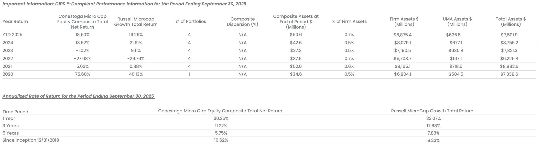 Conestoga Capital Advisors, LLC claims compliance with the Global Conestoga Capital Advisors, LLC claims compliance with the Global Investment Performance Standards (GIPS) and has prepared and presented this report in compliance with the GIPS standards. Conestoga Capital Advisors, LLC has been independently verified for the periods December 31, 1998 through March 31, 2025 by independent verifiers.