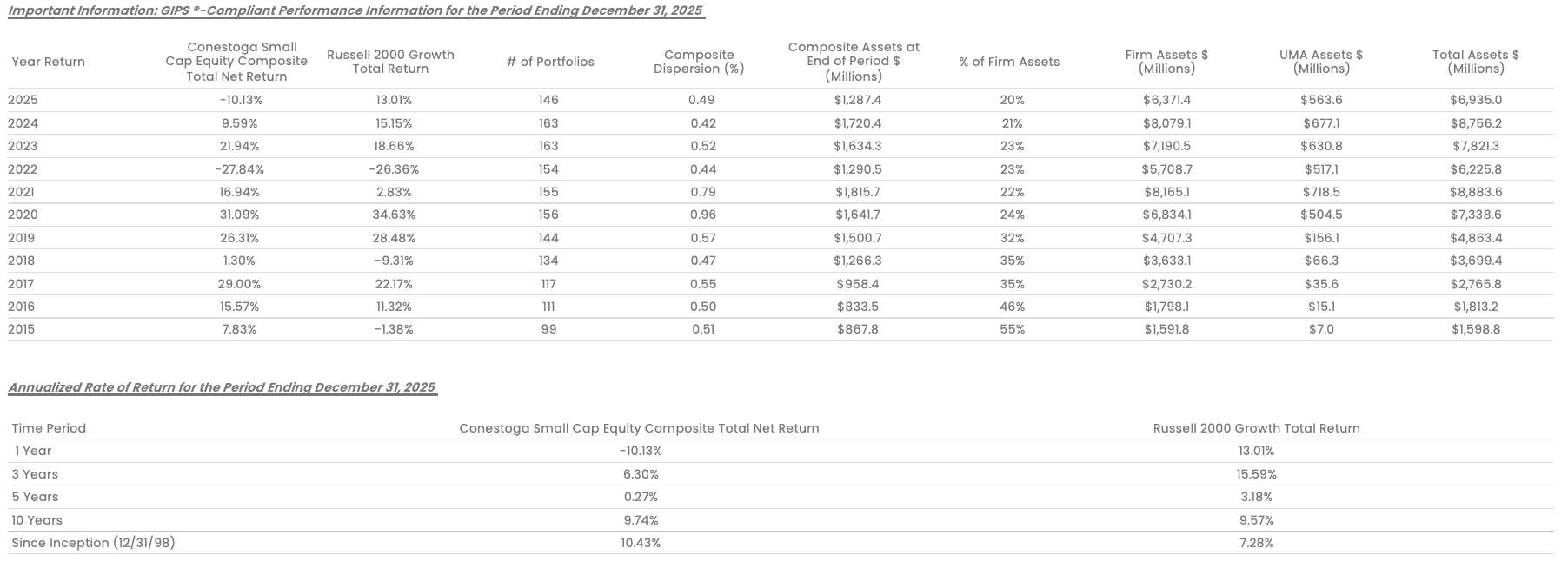 UMA assets presented are not part of Conestoga’s GIPS-defined firm assets as Conestoga has no trading authority over these assets and serves in an advisory-only capacity. UMA assets under management are received on a preliminary quarterly basis, which are subject to change by the plan sponsor after a complete reconciliation of the underlying accounts. The “Total Assets” include UMA assets and are not part of the GIPS firm assets. UMA and Total Assets are shown as supplemental information.