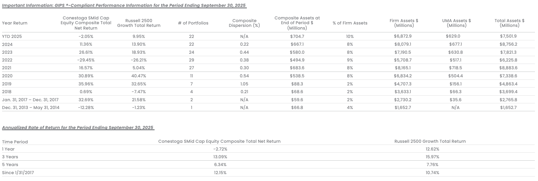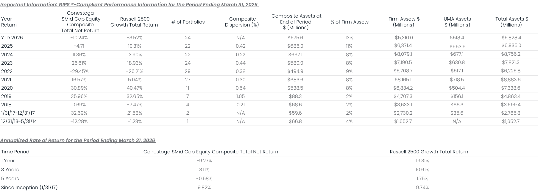UMA assets presented are not part of Conestoga’s GIPS-defined firm assets as Conestoga has no trading authority over these assets and serves in an advisory-only capacity. UMA assets under management are received on a preliminary quarterly basis, which are subject to change by the plan sponsor after a complete reconciliation of the underlying accounts. The “Total Assets” include UMA assets and are not part of the GIPS firm assets. UMA and Total Assets are shown as supplemental information.