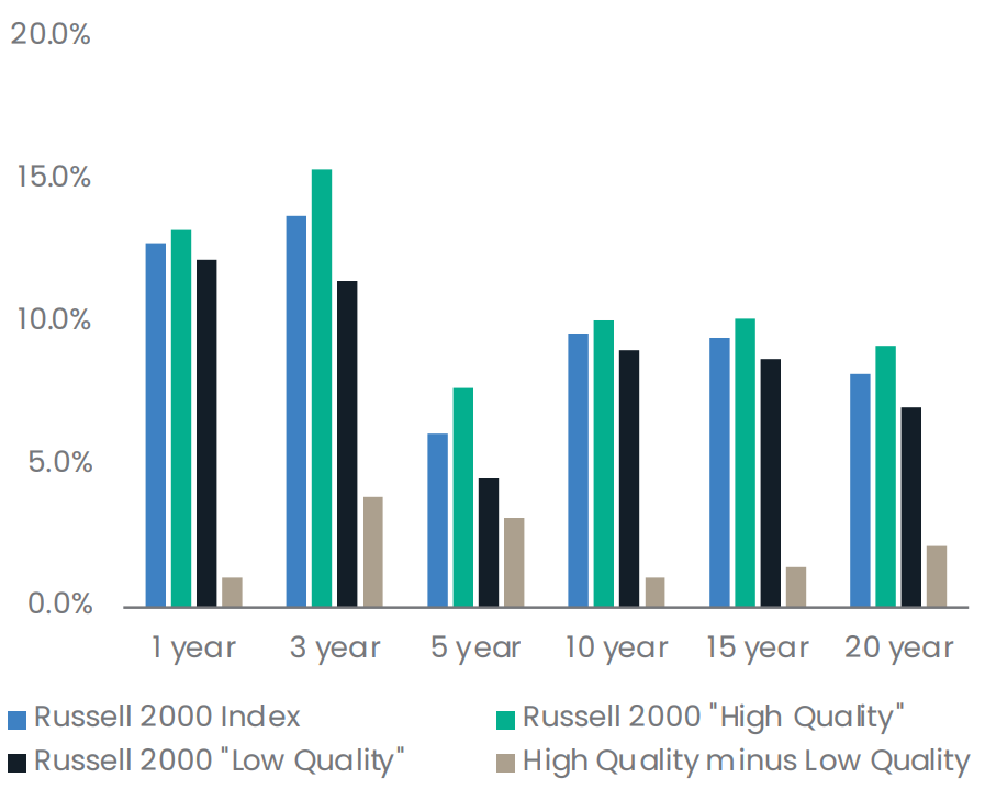 We believe this type of approach is increasingly important in Small Cap investing. Two points make that clear. First, a rising portion of the Small Cap public equity universe is comprised of money-losing companies, with over 40% of companies in our Russell 2000 Growth Index benchmark currently unprofitable (Exhibit 1). Second, high-quality Small Cap stocks have outperformed both the Russell 2000 Index and low quality Small Caps across the trailing 1-, 3-, 5-, 10-, 15-, and 20-year periods. In fact, since 2005, high quality outperformed low quality by more than 2% per year annualized (Exhibit 2).